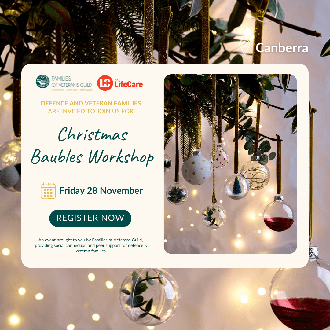 Create festive baubles: free workshop for war widows, defence and veteran families Join us on Friday 28 November 2025 at the Queanbeyan Veteran and Family Hub for a free Christmas bauble workshop. Open to all war widows, defence and veteran families, this festive session offers a relaxed space to get creative, make handmade decorations, and […]