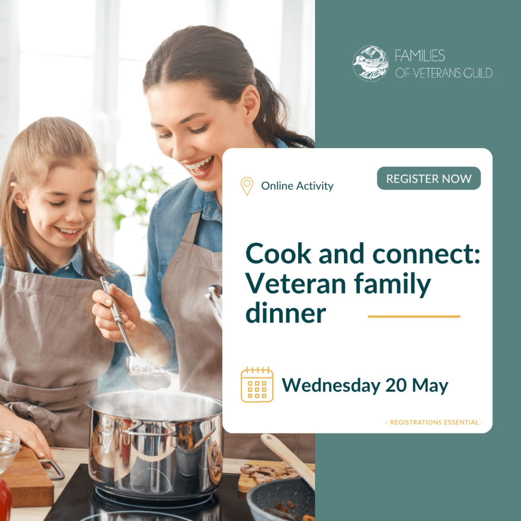 Join us for a relaxed evening of good food and conversation at our next online Veteran Family Dinner via Zoom on Wednesday 20 May 2026. Whether you’re a war widow, partner or parent of a current or former ADF member, or part of a defence or veteran family, you’re warmly invited to share a meal and connect from your own kitchen.